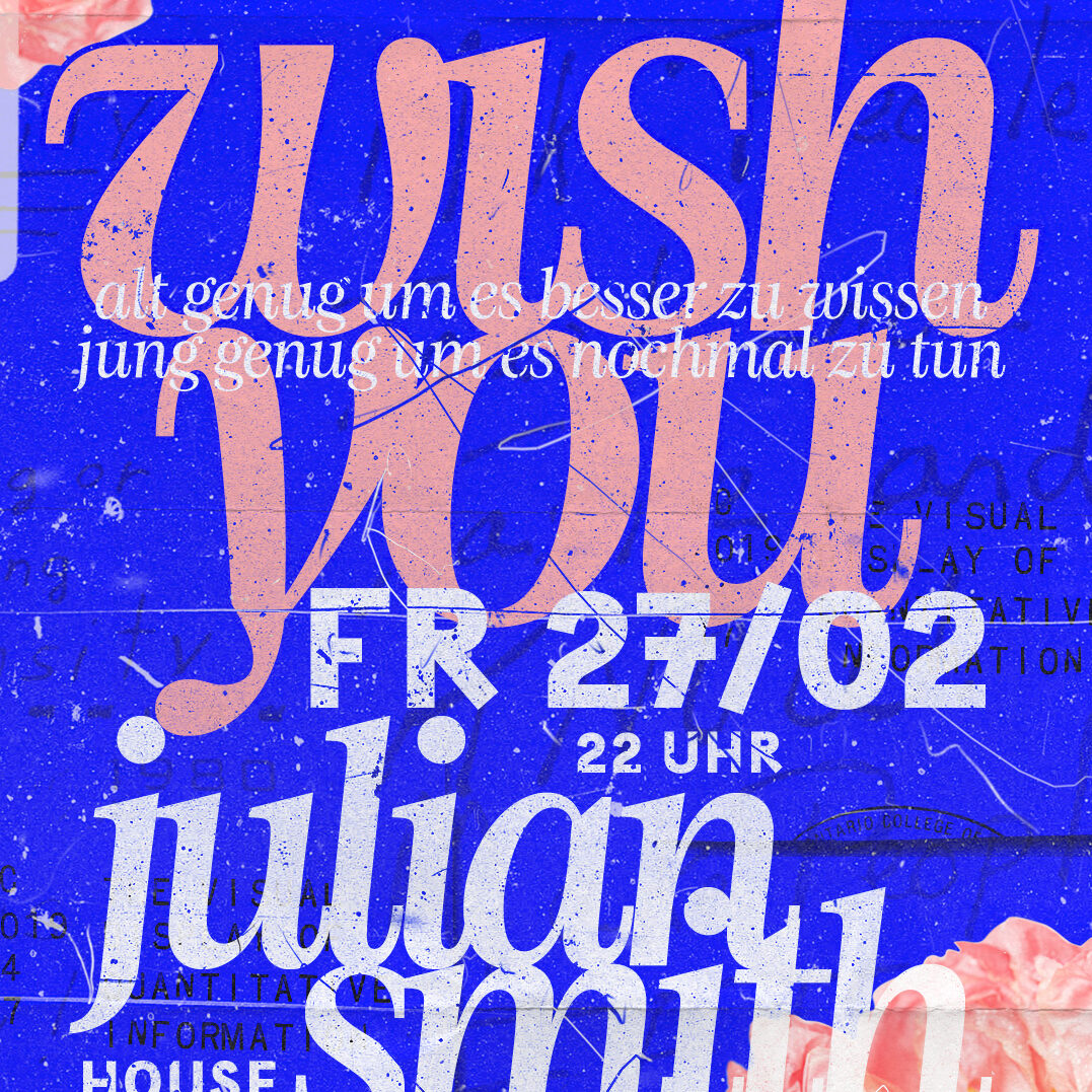 Unter dem Motto „alt genug, um es besser zu wissen, aber jung genug, um es wieder zu tun“ feiern wir am 27. Februar das Leben. Mit dabei ist die Frankfurter Legende Julian Smith, der den Abend mit einem musikalischen Mashup so richtig einheizt.