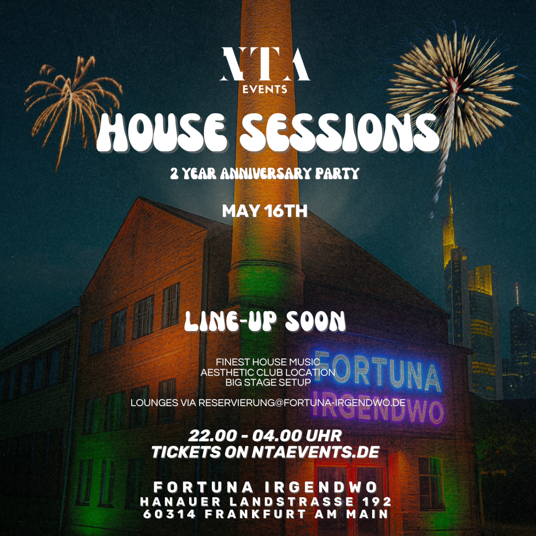 Bereit für ein exklusives House Music Erlebnis? NTA EVENTS feiert das 2-Year Anniversary Special der NTA HOUSE SESSIONS und bringt zum zweiten Jubiläum erneut echte Ibiza-Vibes direkt ins Fortuna Irgendwo. Für den perfekten Vibe sorgen Special-Lichtshows und hochwertige Bühnentechnik, die die House-Beats perfekt in Szene setzen.