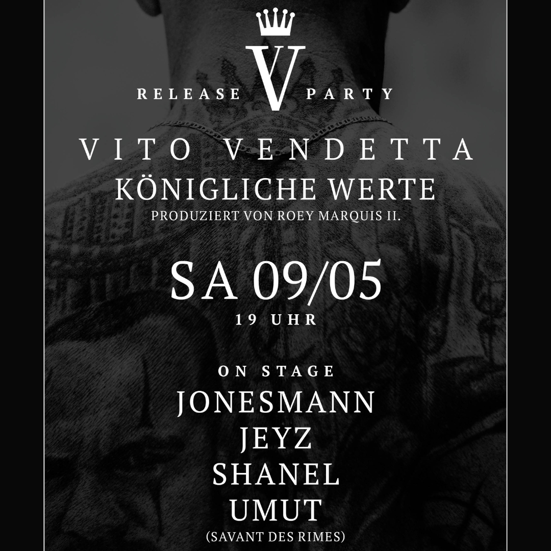 Am 09.05. wird Geschichte geschrieben. Die Release Party zum Album „Königliche Werte“ von Vito Vendetta – ein Projekt, das für echten Hip Hop Sound aus Frankfurt steht. Produziert von Roey Marquis II – einem Namen, der seit Jahrzehnten für authentischen Frankfurter Sound steht – ist dieses Album kein Trendprodukt, sondern ein klares Statement. Und jetzt kommt das, was man so nicht oft erlebt: Die Deutschrap-Legenden Jonesmann & Jeyz stehen wieder gemeinsam auf der Bühne. Viele kennen sie noch von früher als Die Chabs – und genau diese Energie kommt zurück. Dazu live: Shanel – mit dem Sound zwischen Straße und Gefühl.